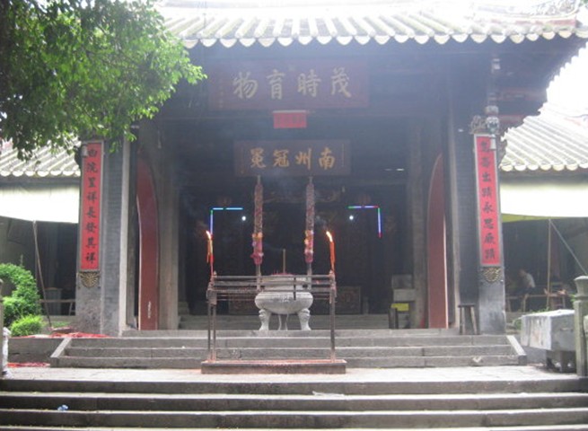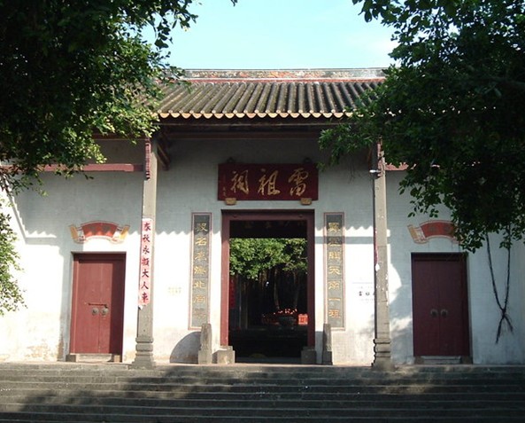 唐貞觀十二年正月十五日,正當城工告竣,文武僚屬歡欣巡城之際,文玉卻生兩翅,白日升天。百官見狀,伏地而拜,文玉終年68歲。為了紀念這一個德政昭彰的地方官,郡民于州城西南五里英鎊山立詞以把,即今之“雷祖調”。調依山而筑,北村南趨,山下是一望無垠的萬頃洋田,其勢極其雄偉壯觀。調分三進,由山門、正殿、側殿、后殿、東西康、鐘鼓樓、碑廊等建筑組成,全部建筑沿中軸線布局。順山門青石板臺階抬級而上可直通后殿,占地面積一萬多平方米,是嶺南地區(qū)最大的洞堂之一。山門依屋字三間面寬洞開而開,為硬山頂,硬山潤模式結構。山門對聯(lián):“霹雪開天南一祖,聲名為海北同尊”,是對雷祖降世的美麗傳說及“受職父母邦,德政彰明”的贊譽。二進為洞的建筑主體,分正殿及東、西側殿。正殿前設有拜事,整個建筑形制呈“凸”字形排列,依次供奉陳文主(中)、李太尉(即漢朝的李廣,居左)及英山石神(右),俗稱“雷桐三殿”。正殿面寬進深各三間,硬山頂,四往格梁式梁架結構,舉梁平緩,前檐顧出檐極寬,建筑風格獨特,富有地方特色。沿著前增顧可從東側殿直通西側殿,殿前屏風精雕細刻,玲挑剔透,巧奪天工。