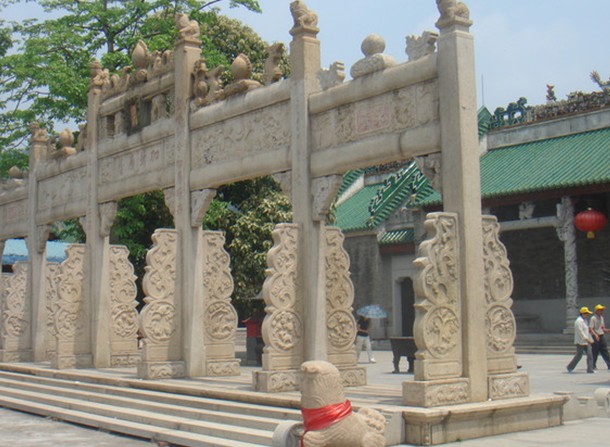 白沙龍母廟現(xiàn)存較好的是"廣蔭坊",它是一個(gè)不可多得的清代古觀石牌坊。廣蔭坊立在500毫米高的精雕花崗巖石須彌座上,面寬17M,高6.5M(廟面寬33.33M),約為廟寬1/2,六柱開間,全為花崗巖石精雕而成的沖天柱石牌坊。上鑲一塊前后兩面刻著剛勁有力的宋體"圣旨"的匾額,下額枋板的匾額中刻有穩(wěn)健,莊重的"加封廣蔭"與背面歷代帝皇的八大封號,兩則邊上配以人物花卉。版權(quán)所有山東聊城聊之旅國際旅行社有限公司,轉(zhuǎn)載必究!左右額枋板上前后以一種風(fēng)韻雅趣的構(gòu)圖刻出玉龍戲水與雄獅下山的精雕石刻。稍間的額枋板上的匾額也刻有"永濟(jì)","孝道"的雄健大字,邊上各有花卉相配,柱上刻有穩(wěn)健的楷書楹聯(lián)及記事。