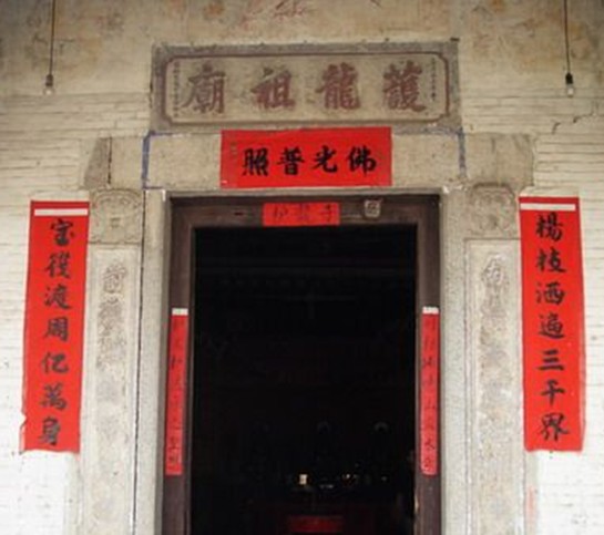 護(hù)龍祖廟在端州區(qū)黃崗鎮(zhèn)前村,始建于清初,同治十年(1871)重修。四周古樹懷抱,環(huán)境清幽,有小溪潺潺流過(guò),廟前遠(yuǎn)眺,田園秀色一覽無(wú)遺。廟為三進(jìn)院落四合院式布局,面積136平方米,大門上方鑲嵌楷書“護(hù)龍祖廟”石匾,前后殿為硬山頂,面寬進(jìn)深均三間,建筑物前設(shè)“低頭牽”,抬梁與穿十混合式梁架結(jié)構(gòu),兩殿之間以平面方形的卷棚頂廟亭相連,亭兩側(cè)空地邊緣,還用矮墻連貫前殿與后殿,使之渾然一體。該廟是肇慶市端州區(qū)目前保存最完整的廟宇。1984年公布為肇慶市文物保護(hù)單位。