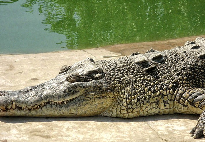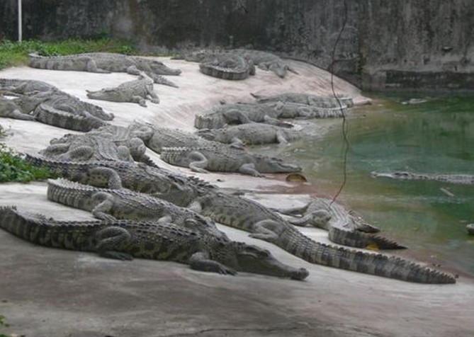 在白藤湖內(nèi)尖峰橋湖心路口即可望到鱷魚(yú)島那金碧輝煌,巍峨壯麗的泰式門樓,門前寬廣的停車場(chǎng)可一次性停放上百輛大巴,進(jìn)入大門后,有一個(gè)十分醒目、高達(dá)4米的大型鱷魚(yú)雕像——“鱷魚(yú)一家”吸收不少游客紛紛在此攝影留念,離雕像百米處,十多個(gè)鱷魚(yú)池座落在鮮花叢中、綠茵地上、池中養(yǎng)有我們祖先稱為“噴火龍”、“鮫龍”的楊子鱷、泰國(guó)灣鱷、馬來(lái)鱷、雜交鱷等四個(gè)品種,大小近千條,最小的有剛出殼的幼鱷,體型最大的有4米多長(zhǎng),重達(dá)千斤。