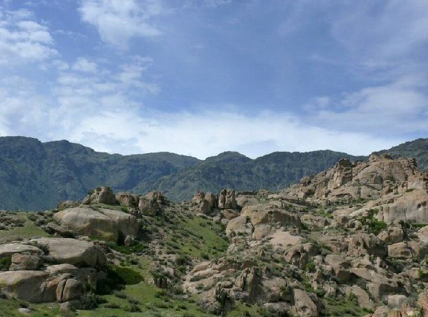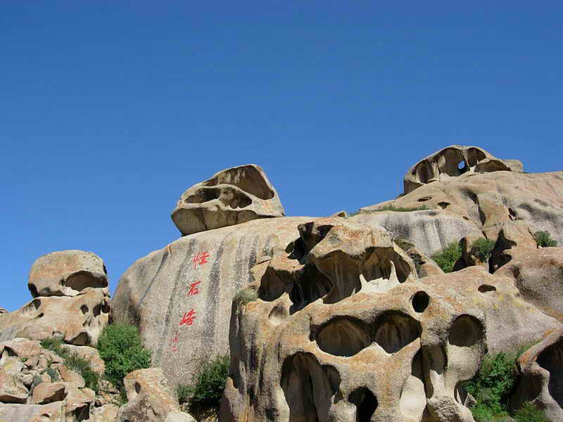 從博樂市北行偏東行38公里,就到了怪石峪。 怪石峪為一峽谷,然谷內(nèi)無懸崖峭壁,也無峨峰刺天。整個(gè)山體,如人工用億萬巨石所砌。所砌之石,皆呈圓角,且有竅孔,石面光滑,無嶙峋之跡,令人稱怪,故稱“怪石峪”。當(dāng)?shù)毓_克族同胞稱怪石峪為“闊依塔什”,意思是“遍地像羊一樣的石頭”。因?yàn)檫@些光滑的巨石,遠(yuǎn)遠(yuǎn)望去,如同羊群擠在山坡。