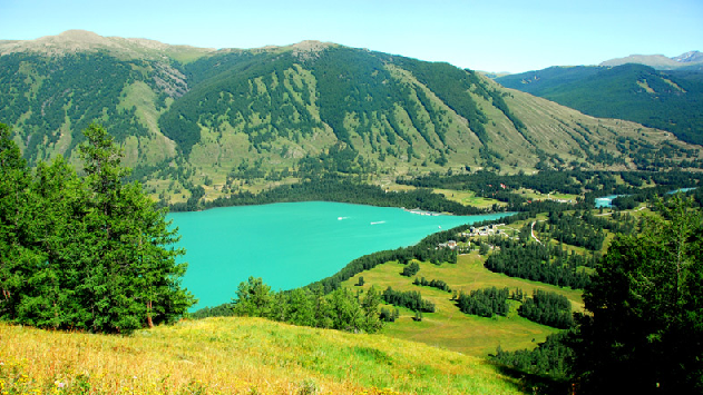當(dāng)?shù)胤Q卡贊湖即鍋底湖,是取其形狀象鍋底而得名,臥龍灣位置處在布爾津縣去喀納斯的途中距縣城140公里,距喀納斯10公里。湖四周森林茂密,繁花似錦、綠草如茵,湖中小島景色秀麗,湖進(jìn)水處巨石抵中流,激浪拍巨石,玉珠飛濺。湖的泄水口有座木橋飛架東西,站在橋上向北是一平如鏡的臥龍灣向南是奔騰咆哮的喀納斯河。