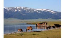 鴨澤湖位于喀納斯村南邊,它是由喀納斯河改道后廢棄河段——牛軛湖洼地組成,呈長(zhǎng)形蝶狀,沿洼地南端形成一個(gè)南北走向的寬淺湖泊,形似蝶狀的一弘碧水與沼澤濕地連為一體,長(zhǎng)3km,寬600~800m,面積約1.3 平方公里,湖周開闊平緩,湖泊似鏡。湖水與周圍開闊的沼澤濕地和河谷草原上,棲息著種類繁多的禽鳥,成群的野鴨、大雁和天鵝等也時(shí)常光顧此地,它們?cè)趯庫(kù)o的水面上安閑的游戈。據(jù)說(shuō),當(dāng)野鴨群被驚動(dòng)時(shí),便會(huì)看到它們一只只、一批批漸次飛起,翅膀拍打著水面,十分壯觀。也許是季節(jié)的關(guān)系,我們沒(méi)能看到成群的野鴨,但卻看到碧綠的草地環(huán)繞明鏡般的湖水,寧?kù)o秀美,廣袤的沼澤草原上,牛羊在游閑覓食,白色的蒙古包星星點(diǎn)點(diǎn),帳篷前的地灶上,炊煙裊裊,與青山和白云構(gòu)成一幅天然的巨型山水畫,令人賞心悅目。