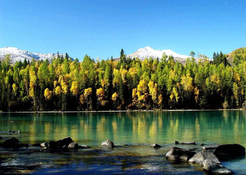喀納斯湖會隨著季候和天氣的變化時(shí)時(shí)變換著自己的顏色:或湛藍(lán)、或碧綠、或黛綠、或灰白……有時(shí)諸色兼?zhèn)洌瑵獾嚅g,成了有名的變色湖。受強(qiáng)勁谷風(fēng)的吹送,倒入喀納斯湖的浮木,會逆水上漂,在湖的上游湖灣處聚堆成千米枯木長堤,蔚為喀納斯湖的一大奇觀。