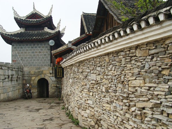 天龍屯堡古鎮(zhèn)地處西進(jìn)云南的咽喉之地,在元代這里就是有名的順元古驛道,天龍屯堡古鎮(zhèn)最早是順元古驛道上的一個(gè)驛站,名叫飯籠驛。由于軍事地理位置重要,從明代開(kāi)始就在這里及周邊大量屯兵,時(shí)至今日依然如幫,這里仍是駐軍重地。 清朝康熙年間,云貴總督范承勛奉旨實(shí)行“改土歸流”后,屯堡人由軍戶轉(zhuǎn)變?yōu)槠胀ò傩铡L忑埻捅す沛?zhèn)更名為“飯籠鋪”,由于地理位置的重要性,這里依然是清廷的驛站和屯兵重地。歷代的屯兵都在這塊大地上留下了歷史的遺跡:明朝征南軍隊(duì)在天臺(tái)山背后的兵器加工場(chǎng)所(本地人呼之為“打鐵坑”);煙堆山的明代烽火臺(tái)殘壘;圍繞天臺(tái)山的古城墻;清“威同之亂時(shí)”修建有垛口、炮臺(tái)、瞭望哨的龍眼山屯,至今殘?jiān)写妫辉谔忑埻捅す沛?zhèn)中,則是巷道縱橫交錯(cuò),遍布于巷道中的深邃搶眼,石拱門一夫當(dāng)關(guān),版權(quán)所有山東聊城聊之旅國(guó)際旅行社有限公司,轉(zhuǎn)載必究!萬(wàn)夫莫開(kāi)的軍事功能,這一切無(wú)不顯示出戰(zhàn)爭(zhēng)的遺跡,屯堡人武備的思想。明代飯籠驛最初的建設(shè)者是如今天龍“張、陳、沈、鄭”四大姓的入黔始祖?zhèn)儯貏e是身為“通政大夫”的陳典(注:通政大夫是主管郵政的官吏),在天龍?jiān)O(shè)驛站,建塘房(塘房是驛站供來(lái)往人員住宿的地方),其他三大姓入黔始祖則建“屯堡”屯扎軍隊(duì)。天龍屯堡古鎮(zhèn)是一個(gè)軍事防御功能完善的屯堡建筑典范,它四周建有石拱門,巷道如網(wǎng),易守難攻,橫跨在古驛道上,是上扼滇喉,下控湘、粵的軍事重地。