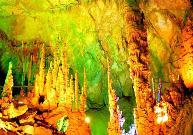 黃山歸來不看岳, 織金洞外無洞天, 瑯嫘勝地瑤池景, 如信天宮在人間。貴州屬于喀斯特巖溶地質(zhì)地貌,故形成了山中有洞洞中有景的地理征,出現(xiàn)了石林、石溝、石牙、峰林、漏斗、天生橋、巖溶湖、瀑布等地表巖溶形態(tài),又有溶洞、地下河、地下湖、鐘乳石、石柱、石筍、石幔等地下巖溶形態(tài)。從而組成了發(fā)育完整、類型多樣、造形奇特、宏偉瑰麗的巖溶洞穴系統(tǒng)。畢節(jié)織金洞便是這之中的姣姣者。織金洞又名打雞洞,位于織金縣境內(nèi)。它由11個(gè)景區(qū),47個(gè)廳堂,150多個(gè)景點(diǎn)組成一個(gè)天然洞穴美景。洞口是花園式的迎賓廳,千奇百異的花草點(diǎn)綴著"雙獅"、"玉蟾"、"飛來石"等石景,迎接著來自遠(yuǎn)方的客人;正午時(shí)分,烈日當(dāng)空,萬道金光從洞頂灑向織金洞,在水蒸氣的繚繞彌漫中彩環(huán)重現(xiàn),陽光下的小水滴恰如一串串晶瑩而透明的珍珠散落人間,其境美不勝收,其意可幻可切。琳瑯滿目的鐘乳石,大的數(shù)十丈,小的如手掌,織金洞的銀雨樹,是一種罕見的花狀透明結(jié)晶體,從白玉似的托盤中沖天而起達(dá)17米,亭亭玉立、珠光寶氣;水晶宮又名雪香宮,宮內(nèi)的鐘乳石表面皚皚石雪,頂頭冰柱高掛,地上石筍密布,幌如東海龍宮。