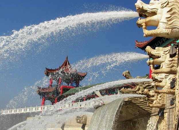 九龍?zhí)妒强死斠篮拥脑搭^所在,地處克拉瑪依河穿城風(fēng)景帶之首—東郊瀑布景區(qū)內(nèi)。該景區(qū)主要由高約8米的人工瀑布、瀑布下的巨潭和周圍大面積的綠化林帶草坪構(gòu)成。瀑布水源來自風(fēng)克干渠湍急的水流從中間的一條巨龍口中噴出,利用水的噴涌速度和自然重力形成寬約10米的巨大的瀑布,瀑布的兩邊分列的8條龍嘴也同時噴出水柱,構(gòu)成一副巨大的水廊。
