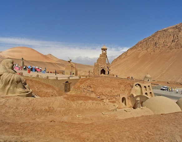 吐魯番可以說是古代生土藝術的精粹之地,但隨著古代宗教戰(zhàn)爭的破壞和現代化進程導致的風俗的移易,生土藝術日漸式微,僅存的也不過是些廢墟遺跡,生土藝術的存續(xù)面臨斷裂。而大漠土藝館因地制宜,利用吐魯番干旱少雨之條件,就地取材,直接用當地的泥土為材料進行建造和雕塑。大漠土藝館內的建筑和雕塑完全根據生土藝術塑造原則建造而成,有天然天成之趣,是古代西域生土藝術的一種現代成熟展示。大漠土藝館不但延續(xù)了古生土藝術之淵脈,而且還匠心得發(fā)揚了生土藝術的傳統,館區(qū)內的建筑和群雕獲得了廣泛的贊譽即是佐證,由此開創(chuàng)了文化旅游僅限于文件旅游的先河,成為新疆獨一無二的文化旅游的開拓先鋒。