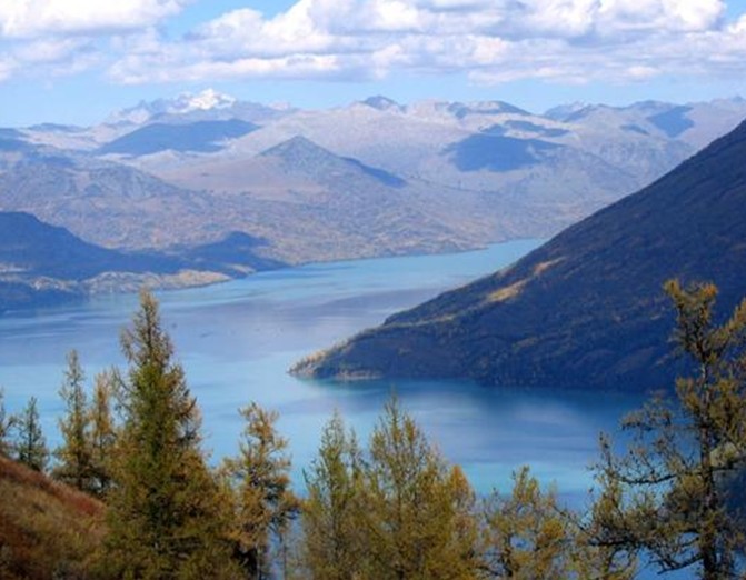 湖面呈北西向狹長(zhǎng)的彎月狀展布,長(zhǎng)約13km,寬1~3km,面積約9.3km2,最大湖深7.5m,平均湖深2.0m,容積約4.0×107m3。由8個(gè)小湖泊相連組成,湖水為無色透明的淡水,礦化度1~2g/L,PH值8。湖水夏季水溫17℃,冬季結(jié)冰,最厚處40cm。湖區(qū)年平均氣溫9.9℃,1月平均氣溫-9.0℃,極端低溫-27.6°C,7月平均氣溫 23.8℃,極端高溫40.7℃,年降水量60.8mm,蒸發(fā)量1896.5mm。主導(dǎo)風(fēng)向西北,最大風(fēng)速20m/s。每年12月初湖水開始結(jié)冰,解凍期為翌年3月中旬。5月初至 10月底為旅游季節(jié)。