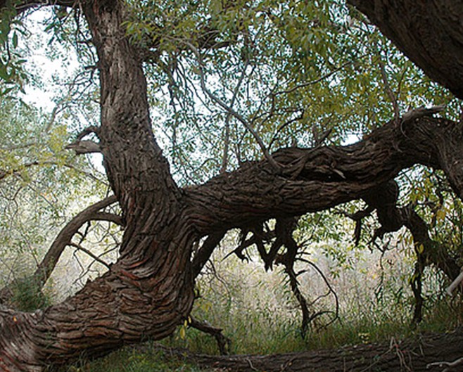 墓地周圍為戈壁荒丘,圓中卻以美麗奇特的大自然風(fēng)光、豐富多彩的植物資源、古樸淳厚的少數(shù)民族文化而享有盛譽(yù)。園中的樹木種類很多,有楊樹、榆樹、柳樹、白蠟樹、還有核桃、杏樹等。那些蒼勁的古樹,有的曲折盤旋,貼地而伸;有的匍匐在地,猶如龍蛇之狀;有的軀干壯碩穩(wěn)固,枝條隨風(fēng)起舞;有的樹頭與根部相連,分不清哪是根,哪是枝;有的樹倒地后,又從根部生出新枝,筆直向上,長成參天大樹。園中有一棵斜長的大樹,根部早已腐朽,而樹冠依然生機(jī)勃勃。園中最高大的一棵楊樹,據(jù)資料介紹高96.23米,直徑6.25米。