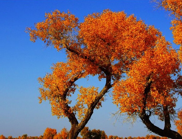 在我國巴音郭楞自治州最長的內(nèi)陸河塔里木河,分布著世界唯一的最大原始胡楊森林公園保護(hù)區(qū),全世界胡楊林有百分之十在中國,而中國的胡楊林有百分之九十在新疆塔里木河畔。它的祖先遠(yuǎn)在一億三千五百萬年前早就出現(xiàn)了,被地質(zhì)學(xué)家稱為“第三世紀(jì)活化石”是世界上最古老的一種楊樹。