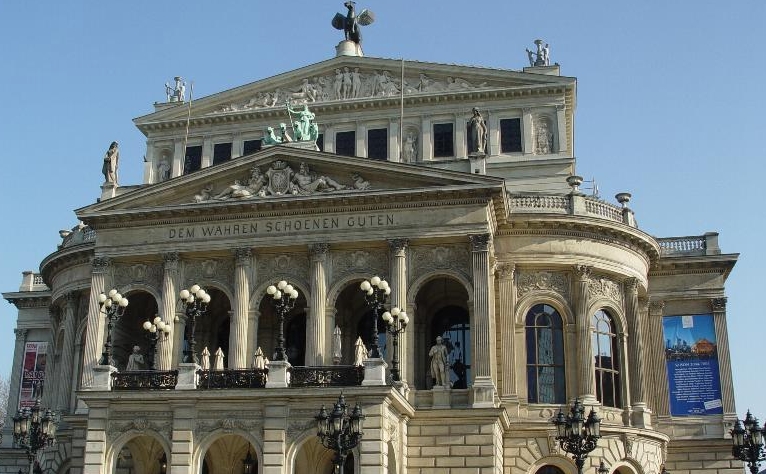 開演當(dāng)年威廉一世皇帝觀看了首場(chǎng)演出之后,大為感動(dòng),宣布說(shuō)唯有法蘭克福能繼承如此金碧輝煌,1945年戰(zhàn)爭(zhēng)以后它完全成為廢墟,七十年代末的修繕共花費(fèi)了兩億四千萬(wàn)馬克,新建采用新古典主義式。
