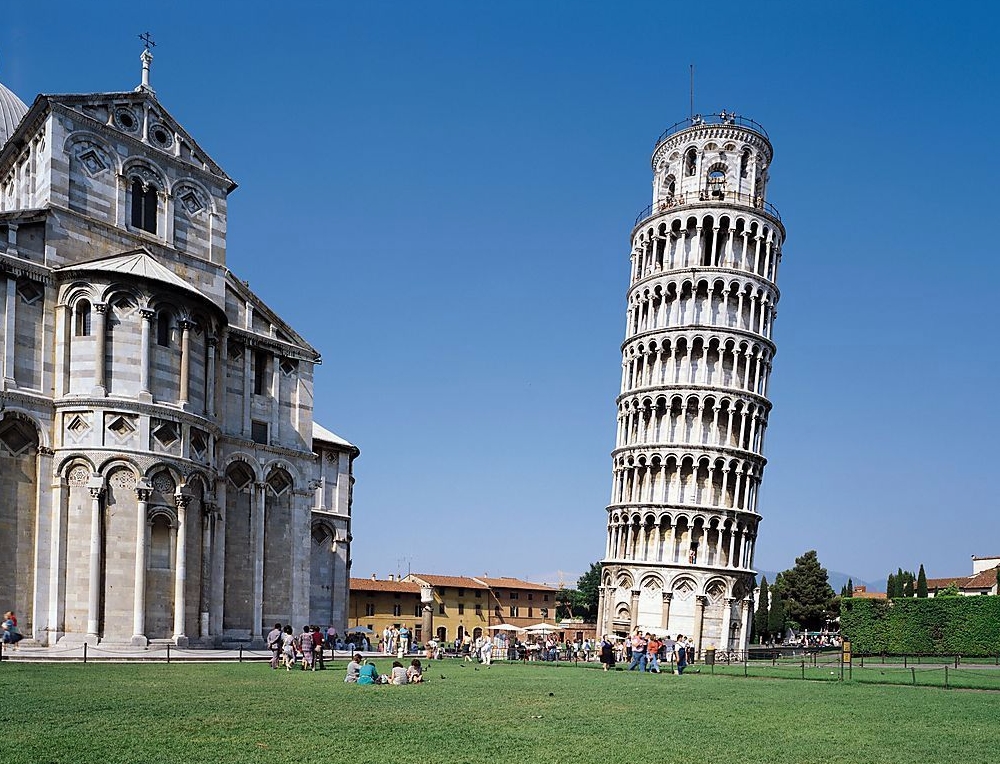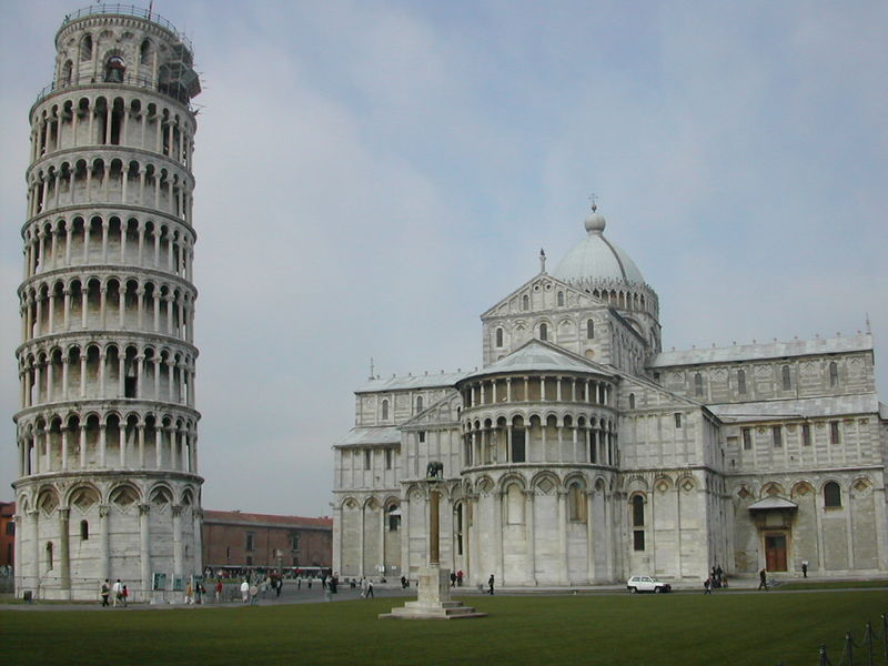 比薩斜塔(意大利語(yǔ):Torre pendente di Pisa或Torre di Pisa)是意大利比薩城大教堂的獨(dú)立式鐘樓,于意大利托斯卡納省比薩城北面的奇跡廣場(chǎng)上。廣場(chǎng)的大片草坪上散布著一組宗教建筑,它們是大教堂(建造于1063年—13世紀(jì))、洗禮堂(建造于1153年—14世紀(jì))、鐘樓(即比薩斜塔)和墓園(建造于1174年),它們的外墻面均為乳白色大理石砌成,各自相對(duì)獨(dú)立但又形成統(tǒng)一羅馬式建筑風(fēng)格。比薩斜塔位于比薩大教堂的后面。
