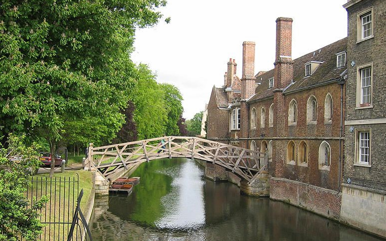 走進(jìn)皇后學(xué)院,可以見到一座古老的木橋橫跨于劍河之上,這就是舉世聞名的數(shù)學(xué)橋,又叫作牛頓橋。相傳牛頓采用數(shù)學(xué)和力學(xué)的方法設(shè)計并建造了這座橋,橋上沒有用一顆釘子。牛頓的學(xué)生認(rèn)為:牛頓老師能做到的事,牛頓的學(xué)生也能夠做到。他們把這座橋拆了,可是怎么也不能把這座橋不用釘子恢復(fù)成牛頓老師建筑的原樣,最后不得不用釘子才重新將木橋架好。這個故事是假的,因?yàn)閿?shù)學(xué)橋是在牛頓死后22年才建起來的。真正的情況是,該橋最早是用鐵釘連接,比較不明顯,但是現(xiàn)在新造的這座用的是螺絲。(不過這座橋似乎確實(shí)是被一名好奇的學(xué)生拆開來,然后再重新裝回去的)。