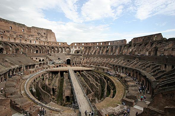 每層的80個(gè)拱形成了80個(gè)開口,最上面兩層則有80個(gè)窗洞,觀眾們?nèi)雸?chǎng)時(shí)就按照自己座位的編號(hào),首先找到自己應(yīng)從哪個(gè)底層拱門入場(chǎng),然后再沿著樓梯找到自己所在的區(qū)域,最后找到自己的位子。整個(gè)斗獸場(chǎng)最多可容納5萬人,卻因入場(chǎng)設(shè)計(jì)周到而不會(huì)出現(xiàn)擁堵混亂,這種入場(chǎng)的設(shè)計(jì)即使是今天的大型體育場(chǎng)依然沿用。 斗獸場(chǎng)表演區(qū)地底下隱藏著很多洞口和管道,這里可以儲(chǔ)存道具和牲畜,以及角斗士,表演開始時(shí)再將他們吊起到地面上。斗獸場(chǎng)甚至可以利用輸水道引水。公元248年在斗獸場(chǎng)就曾這樣將水引入表演區(qū),形成一個(gè)湖,表演海戰(zhàn)的場(chǎng)面,來慶祝羅馬建成1000年。公元217年斗獸場(chǎng)遭雷擊引起大火,受到部分毀壞,但是很快在237年又修復(fù),繼續(xù)舉行人與獸或人與人之間的搏斗表演,這樣的活動(dòng)一直到公元523年才被完全禁止。公元442年和508年發(fā)生的兩次強(qiáng)烈地震對(duì)斗獸場(chǎng)結(jié)構(gòu)本身造成了嚴(yán)重的損壞,在中世紀(jì)時(shí)期該建筑物并沒有受到任何保護(hù),因此損壞進(jìn)一步加劇,后來干脆被用來當(dāng)作碉堡。15世紀(jì)時(shí)教廷為了建造教堂和樞密院,竟然拆除了斗獸場(chǎng)的部分石料。1749年羅馬教廷以早年有基督徒在此殉難為由才宣布其為圣地,并對(duì)其進(jìn)行保護(hù)。約翰?保羅二世教皇生前每年都會(huì)在此舉行儀式紀(jì)念這些殉難的烈士,但是卻沒有歷史證據(jù)顯示確曾有基督徒在此殉難。
