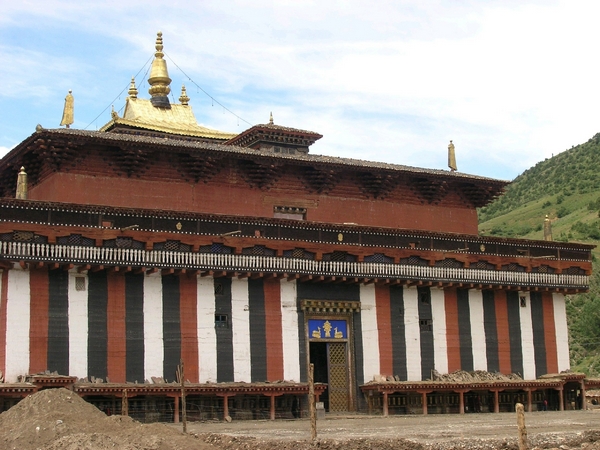 大殿坐西朝東,總建筑面積3334.64平方米。建筑主體呈四方形,邊長(zhǎng)53米,殿內(nèi)柱子林立,共聳立180根柱子,其中64根柱子高約15米。殿堂為三層,高48.15米。下層樓見方長(zhǎng)53米,中層每面長(zhǎng)度為 40.30米,上層每面長(zhǎng)度為12米。這些柱子將殿中的天窗托起,使得原本封閉的大殿,透漏出明亮的光線,較好的解決了藏式寺廟建筑中通風(fēng)透氣不暢、光線不足的問題。