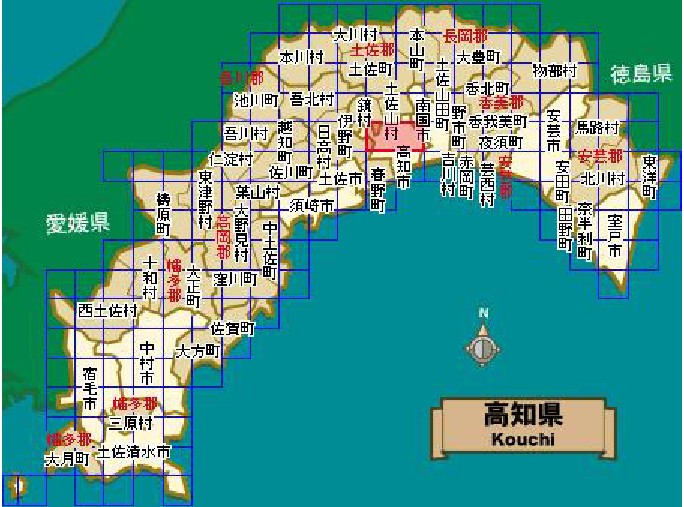 高岡郡(たかおかぐん):中土佐町(なかとさちょう)、佐川町(さかわちょう)、越知町(おちちょう)、梼原町(ゆすはらちょう)、日高村(ひだかむら)、津野町(つのちょう)、四萬十町(しまんとちょう)。