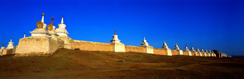 整個(gè)哈拉和林目前主要的觀賞景點(diǎn)主要就剩這個(gè)「額爾德尼召寺」。額爾德尼召寺于1586年由蒙古喀爾喀首領(lǐng)「阿巴岱汗」所興建,是當(dāng)時(shí)喀爾喀王朝的第一座喇嘛黃教寺院,也是蒙古國第一個(gè)佛教中心,長寬各約400公尺,全盛時(shí)期內(nèi)部約有64座廟宇,上千名喇嘛在此生活,周圍由一道白色石墻圍繞,墻上共有108座小白塔,代表108尊羅漢,每座塔與塔之間距離約15公尺,每一座都是紀(jì)念某一件與歷史有關(guān)的大事,或作為某著名政治領(lǐng)袖、活佛或大喇嘛的墳?zāi)埂?/p>
