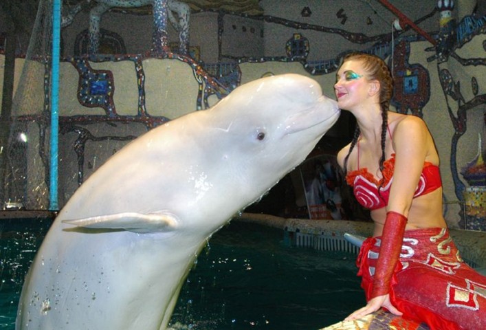 海豚和白鯨是來自不同海域的動(dòng)物,將它們放到一個(gè)表演池中表演,是海洋動(dòng)物表演的突破。