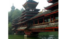 地坪坪風(fēng)雨橋又名花橋,始建于清光緒二十年(1894年)。橋總長70米,高出水面8米,寬4.5米,河中立一青石石墩。橋為木質(zhì)結(jié)構(gòu),橋的下部由兩排各為8根粗大杉木穿榫連成一體,分兩層呈天平狀向邊懸掛。每層挑出約兩米。橋廊兩側(cè)有一米高的梳齒欄桿。欄桿外面又有一層外桃1.4米的挑檐。橋廊內(nèi)兩側(cè)下面設(shè)置連通板凳供人歇憩。 看地坪風(fēng)雨橋真正要看的是它的裝飾。