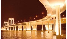 西灣大橋是連接澳門(mén)半島和氹仔島的第三座大橋,于2002年10月8日動(dòng)工興建,主橋于2004年6月28日合龍。西灣大橋北起澳門(mén)半島融和門(mén),南至氹仔碼頭,采用“豎琴斜拉式”設(shè)計(jì),兩個(gè)主橋躉之間跨度達(dá)180米。該橋總長(zhǎng)2200米,分上下兩層:上層為雙向6車(chē)道,下層箱式結(jié)構(gòu),雙向4車(chē)道行車(chē),可以在8級(jí)臺(tái)風(fēng)時(shí)保證正常交通,橋內(nèi)還預(yù)留了鋪設(shè)輕型鐵軌的空間。