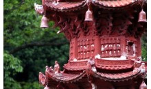 陶塔位于涌泉寺門前兩側(cè)。該對陶瓷千佛塔,高6.83米,于1972年從福州南郊龍瑞寺移來,用作鎮(zhèn)寺之寶。它是宋元豐五年(1082年)用陶土分層燒造,然后拼合累疊而成的。此類以陶燒造的寶塔,在國內(nèi)十分罕見。該對陶塔,東邊的稱“莊嚴(yán)劫千佛寶塔”,西邊的稱“賢劫千佛寶塔”。兩塔形式相同,均為八角九層,每座塔壁均貼有雕塑佛像1078尊,八角塔檐上有四方佛72尊,懸掛陶制塔鈴72枚。石砌塔座刻有金剛力士、蓮瓣、舞獅等,刻銘文記述建造時(shí)間和捐獻(xiàn)者以及造塔工匠的姓名。