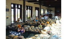 投資2.3億元依山而建的古兜溫泉,集山、泉、湖、海為一體,風(fēng)景優(yōu)美,有著豐富的溫泉資源,在古兜山下新近落成的溫泉谷,格調(diào)高雅,打造出一個(gè)不同凡響的溫泉王國(guó)。溫泉谷中間有一條約150米長(zhǎng)的人工鵝卵石河道,它不僅為景區(qū)增添了春山幽谷的野趣,更和中央水區(qū)的大舞臺(tái)及各大小泡池相連,將谷內(nèi)建筑群落自然分成了三大區(qū)域:北邊是歐式風(fēng)格的“羅馬殿”,東邊則是日本和式風(fēng)格的“東瀛閣”,南邊是“唐宮”。