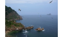 老鐵山位于遼東半島的尖端,系千山山脈的余脈,她與山東半島隔海相望,其間的老鐵山水道是我國最兇險、最涌急的水道。老鐵山燈塔就建在老鐵山角上,海拔86.7米,是清廷海關當局于1893年請法國人制造,由英國人修筑的,雖歷經(jīng)了1894年中日甲午海戰(zhàn)和1904年日俄戰(zhàn)爭,仍保存完好,至今仍為過往船只導航。在老鐵山燈塔下方,是險峻陡峭險的懸崖峭壁,它與山東蓬萊的理論對角線即為黃、渤海兩海分界線。黃、渤兩海的浪潮,由海角兩邊涌來,交匯在這里,由于海底地溝運動和兩海各自不同水色(黃海海水較藍、渤海海水略黃)的作用,形成一道"涇渭分明"的水流,即黃渤海分界線。